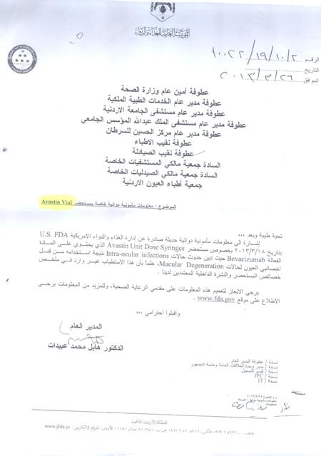 - معلومات مأمونية دوائية خاصة بمستحضر Avastin Vial تاريخ النشر: 22/4/2013